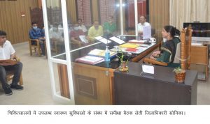 देहरादून दिनांक 20 जुलाई 2022 जिलाधिकारी श्रीमती सोनिका ने आज अपने कार्यालय कक्ष कलेक्ट्रेट में स्वास्थ्य विभाग के अधिकारियों के साथ जनपद में डेगू एवं कोरोना आदि रोग के उपचार हेतु चिकित्सालयों में उपलब्ध सुविधाओं की समीक्षा बैठक ली। उन्होंने चिकित्सा अधिकारियों को कडे़ निर्देश दिए हुए कहा कि अपने-अपने अस्पतालों में रोगियों के उपचार संबंधी किसी भी प्रकार की शिकायत न आयें, इस बात को गम्भीरता से लेना सुनिश्चित करेंगे। कहा कि सुविधा मुहैया कराने में कोई समस्या आती है तो तत्काल वार्ता कर निस्तारण करना सुनिश्चित करेंगे।