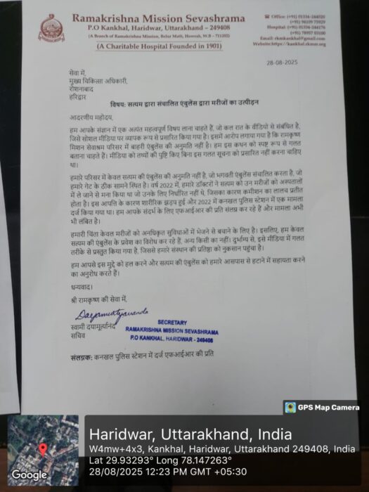 कनखल के बंगाली अस्पताल में बुधवार को हुए एंबुलेंस प्रकरण पर रामकृष्ण मिशन अस्पताल के प्रबंधक महोदय ने एक प्रेस कॉन्फ्रेंस कर इस एंबुलेंस प्रकरण के आरोपों का खंडन किया है ।