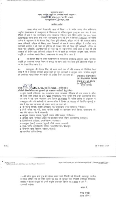 जिलापूर्ति अधिकारी तेजबल सिंह को उधमसिंह नगर भेजा गया,पूर्ति निरीक्षक सनवाल देहरादून अटैच।