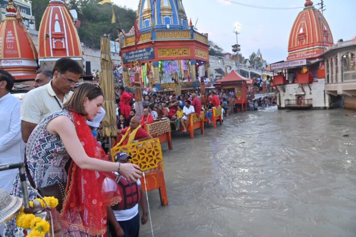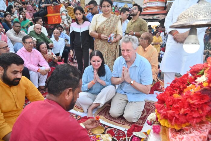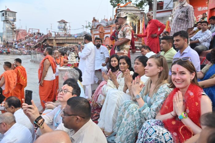 हरिद्वार। अंतर्राष्ट्रीय योग दिवस के अवसर पर मेक्सिको, फिजी, नेपाल, सूरीनाम, मंगोलिया, लातविया, श्रीलंका और रूस के राजनयिक व अन्य उच्च अधिकारियों के साथ ही उत्तराखंड सरकार की ओर से उपाध्यक्ष उत्तराखंड राज्य आपदा प्रबंधन विनय रुहेला सहित अन्य अधिकारियों ने हरकी पौड़ी पहुंचकर गंगा आरती में प्रतिभाग किया तथा मां गंगा की आरती की।