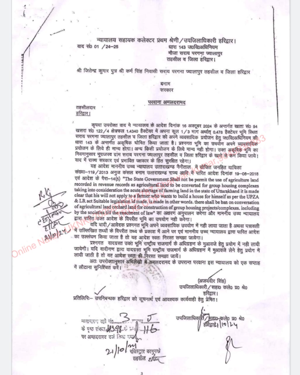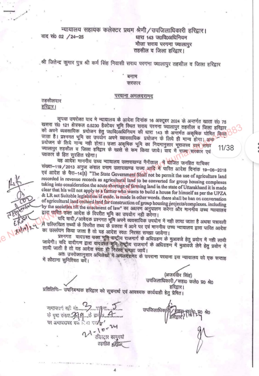 जांच अधिकारी हो या कोई हो कितनी भी कोशिश कर ली जाय एसडीएम साहब तो फंसे हुए ही हैं ।बचेंगे I A S साहब भी नही।लेकिन फिलहाल तो S D M साहब पर बनी हुई है। एसडीएम साहब की गर्दन बिल्कुल फंस चुकी है क्योंकि मामला इतना गंभीर हो गया है । की जिन जितेंद्र ,धर्मपाल व सुमन ने भूमि का लैंड यूज चेंज करने के लिए एप्लीकेशन दी थी ना तो उस एप्लीकेशन पर कोई डेट है यानी दिनांक है कि किस दिनांक को एप्लीकेशन लैंड यूज चेंज करने के लिए दी गई और S D M साहब कृषि को आवाश य करने के लिये इतनी जल्दी में थे की उन्होंने इस प्रकरण में किसी नियम का पालन ही नही किया। नियमानुसार 143 करने के लिए S D M पहले पटवारी फिर नायब तहसीलदार बाद में तहसीलदार की रिपोर्ट आने के बाद 143 करता है क्योंकि नियम यही है । लेकिन यह मामला I A S साहब से जुड़ा था तो किसी नियम की जरूरत S D M साहब ने महसूस ही नही की।