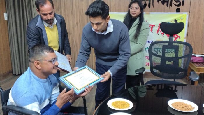 बताते चलें कि राज्य स्तरीय दिव्यांग दक्षता पुरस्कार हेतु जनपद अल्मोड़ा से 4 दिव्यांगों का चयन हुआ है। आज कलेक्ट्रेट में आयोजित सम्मान समारोह में सौरभ तिवारी, रेखा आर्य तथा हिमांशु रावत को जिलाधिकारी ने सम्मानित कर प्रशस्ति पत्र तथा प्रत्येक को 8 हजार रुपए की सहायता राशि के चेक वितरित किए। जबकि पुरस्कार के लिए चयनित चौथे चयनित अर्चना जोशी को हल्द्वानी में सम्मानित किया गया।