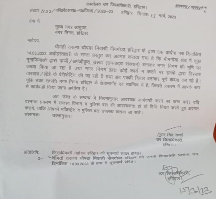 इसी तरीके का एक मुकदमा भीमगोड़ा क्षेत्र में है ,इस भूखंड पर बाकायदा 2023 में एसडीएम पूरन सिंह राणा ने अपनी रिपोर्ट में साफ-साफ लिखा है कि यह भूखंड नगर निगम का स्वामित्व का है, लेकिन नगर निगम ने आज तक इस भूखंड पर अपना कब्जा नहीं लिया है ।अब कब्जा क्यों नहीं लिया है ,यह तो नगर निगम के अधिकारी जानते होंगे, मामला करोडो की भूमि का है ,इसलिए एक नेताजी भी इसमें दिलचस्पी दिखाने लगे हैं ,लेकिन पूरन सिंह राणा एसडीएम की रिपोर्ट तो यही कह रही है की नगर निगम को इसका कब्जा ले लेना चाहिए और नगर निगम के वर्तमान आयुक्त महोदय को हमारी सलाह है ,कि वह करीब 50 करोड़ से अधिक के इस 5 हजार मीटर के भूखंड पर अपना कब्जा लेकर नगर निगम की तरफ से कोई ऐसा कार्य भूखंड में कराए जो क्षेत्र के लोगों के उपयोग में आ सके, ना की कब्जे धारी लोगो की यह मिल्कियत बन जाए।