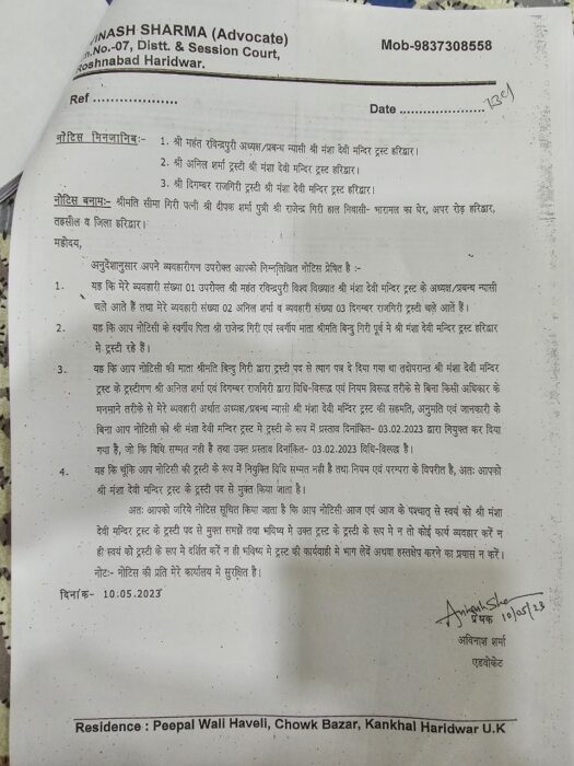 हरिद्वार। हरिद्वार की प्रसिद्ध मां मनसा देवी मंदिर ट्रस्ट के अध्यक्ष महंत रविन्द्र पूरी कि बिना अनुमति के ट्रस्ट के दो अन्य सदस्य, अनिल शर्मा व राजगिरी ने सीमा गिरी को ट्रस्ट का सदस्य मनोनीत कर दिया था।